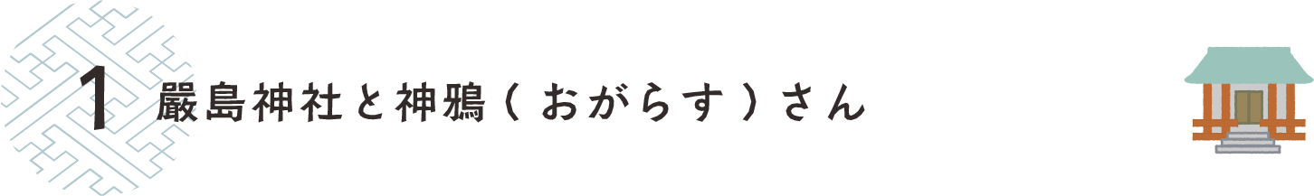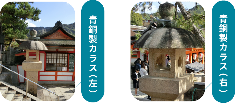 現在の嚴島神社(東回廊)入口の両側には「御嶋廻(おしままわり)」と刻字した石灯篭が立っており、その上部にはブロンズ製のカラスが付けられています。厳島の姫神様が2羽のカラス(神鴉(おがらす)さん)に導かれて、現在の嚴島神社のある場所に鎮座されたという伝説から、宮島ではカラスが神の使いとされています。