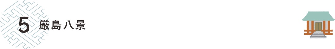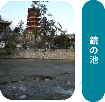 嚴島八景は嚴島の景勝八カ所を選定したものです。「嚴島明燈(いつくしまめいとう)」「大元桜花(おおもとおうか)」「滝宮水蛍(たきのみやみずぼたる)」「鏡池秋月(かがみいけしゅうげつ)」「谷原麋鹿(やはらじか)」「御笠濱鋪雪(みかさはまほせつ)」「有浦客船(ありうらかつせん)」「弥山神鴉(みせんおがらす)」の八カ所は多くの文人によって和歌や漢詩に詠まれています。嚴島神社境内の客(まろうど)神社脇には潮が引くと現れる池があり「鏡の池」と呼ばれています。ここが嚴島八景の「鏡池秋月」と称され、この池に映る月は最も美しいとされています。