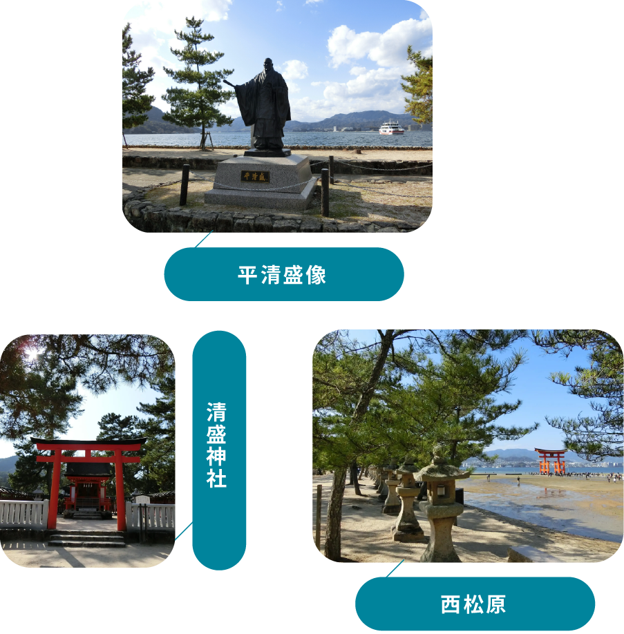 宮島の桟橋前広場には、勇壮な「平清盛像」が建っています。また、嚴島神社出口からすぐの松並木の一帯は「西松原」と呼ばれ、そこには昭和29年(1954年)に清盛の遺徳をたたえて創建された清盛神社があります。宮島の地には、今も清盛ゆかりの歴史が静かに息づいています。