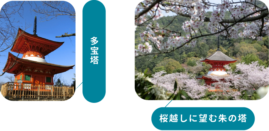 多宝塔は嚴島神社出口からすぐにある宝物館横の階段をのぼったところにあり、眺望が良く桜の季節には人気のスポット。