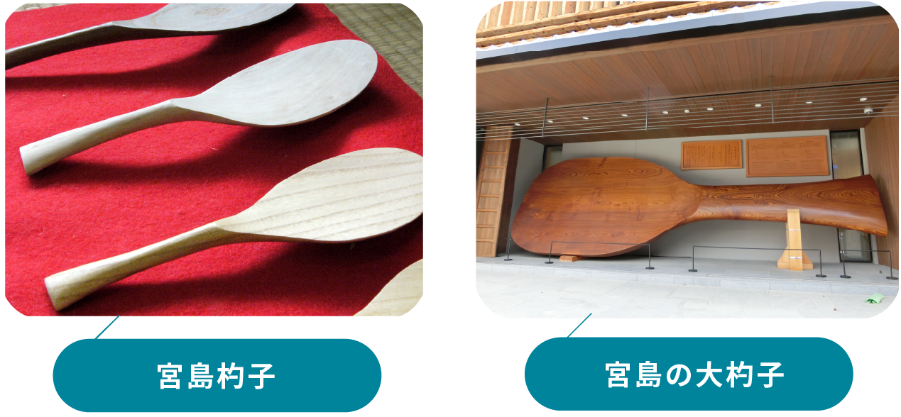 杓子(しゃくし)は宮島のみやげ物として知られています。江戸時代の僧誓真(せいしん)が考案し、島の人に作り方を教えたことが宮島杓子のはじまりと言われています。宮島杓子は「敵をめしとる」または「幸福をすくいとる」など縁起物としても知られています。高校野球大会では、必勝祈願の縁起物として広島県代表を応援するときに杓子が使われています。宮島交流館(宮島まちづくり交流センター)には宮島のシンボルとしてケヤキでできた世界一大きい「宮島の大杓子」が展示されています。この杓子は長さ7.7メートルで重さは2.5トンもあります。