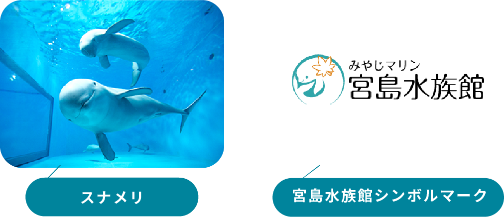 宮島の観光スポットのひとつ、宮島水族館。瀬戸内海の自然、特色を広く伝える展示を見ることができます。愛称の「みやじマリン」は一般公募で2010年に決定されました。「宮島」と瀬戸内海の「海(マリン)」に近い水族館のイメージに合い、親しみやすく覚えやすい名前として多くの作品の中から選ばれました。また、宮島水族館のシンボルでもあるスナメリは、体長160~190cmのイルカの仲間で、背ビレがなく、まんまる顔が特徴の可愛らしい生き物です。瀬戸内海をはじめ、日本の岸に近い海で見ることができます。宮島水族館のシンボルマークもスナメリともみじがデザインされているんですよ。